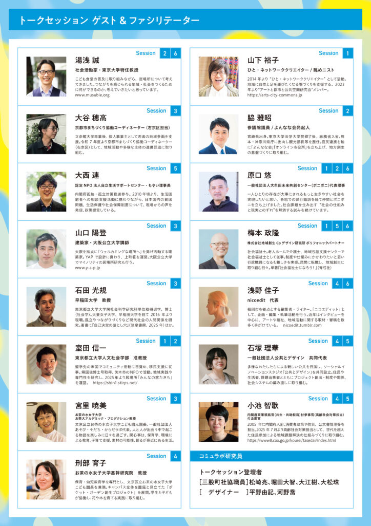 【15日|トークセッション】この5年間、コミュラボが実践してきた「場づくり」や「出会い方」「デザイン」などをテーマに、9 時間(全6トーク)濃密にセッション。福祉や教育、建築など多分野の専門家15名と深掘り。