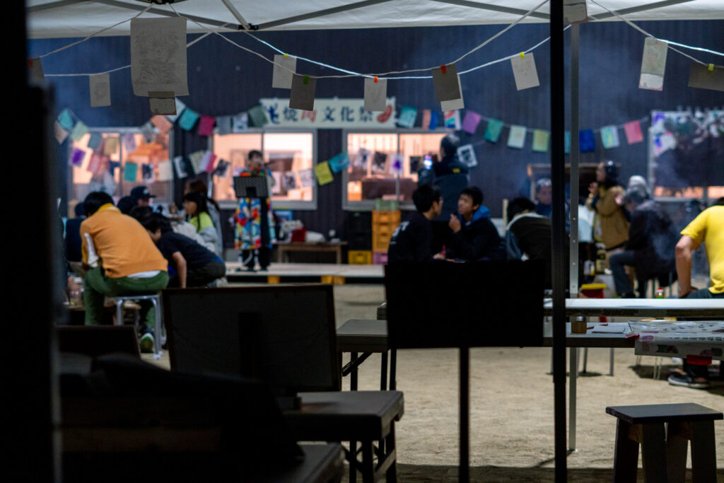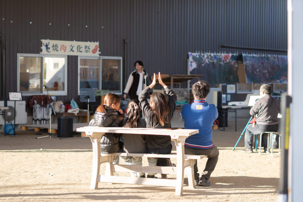 カラぺの片付けが終わった17時過ぎ、待ちに待った「ミート(焼肉)の祭典」の時間だ。愉快なMC2人が、場を盛り上げてくれる。ステージの壁には、さっきみんなと描いたたくさんのカラぺが飾られ、何気なく描いた作品が役に立てたのかと思うと、少し嬉しい気持ちになった。