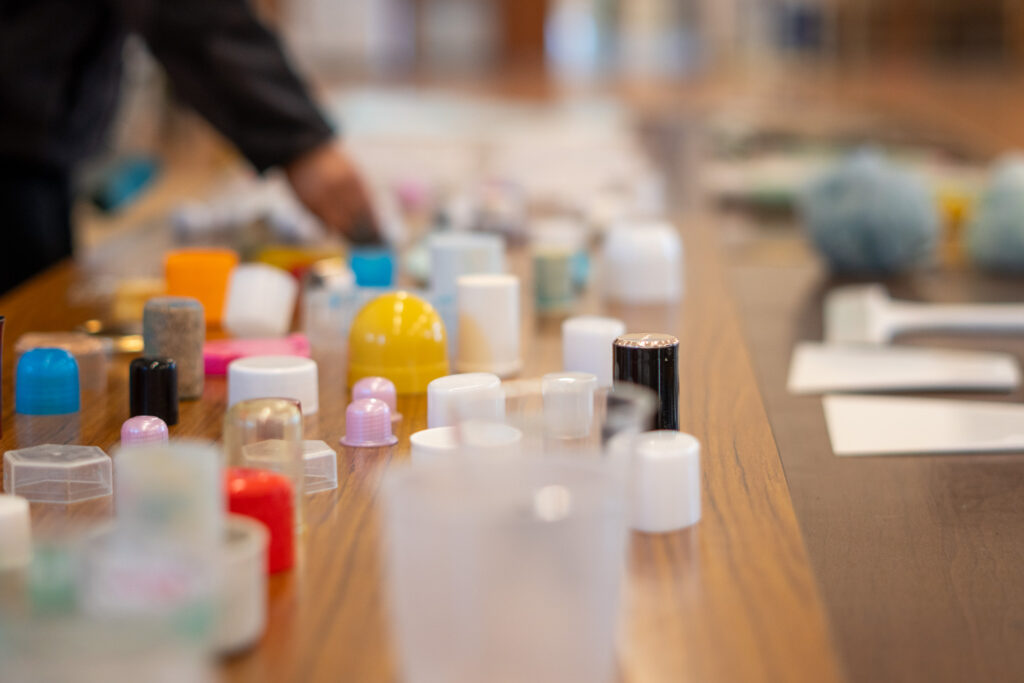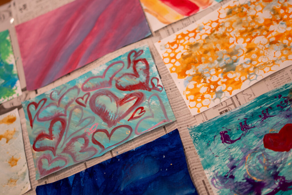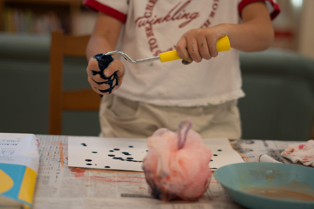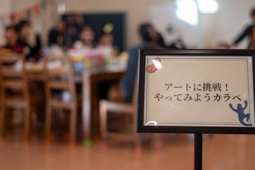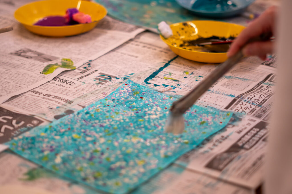 「カラぺ」は、「カラぺハリエ」といって、好きな画材で白紙に色やもようを自由につけた紙のことらしい。大人も子どもも、ただひたすらに目の前の紙に向かっている。ずらりと並んだ絵の具や道具たち。やるつもりはなかったけど、それを見た瞬間「やってみたい」という気持ちが立ち上がってきた。