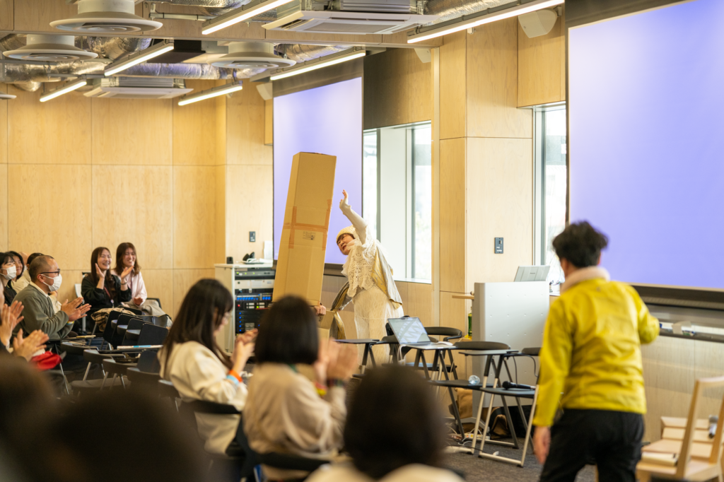 あっという間に13時を回った。通しで参加してくださったみなさんは、お昼ご飯を食べられたのだろうか。情報過多になっているかもしれない頭を少しクールダウンさせる、不意打ちのブレイクアウトタイム。コンテンポラリーダンサーのAYARTさんと、段ボールに隠れた自衛隊がコラボし、会場を和ませてくれた。