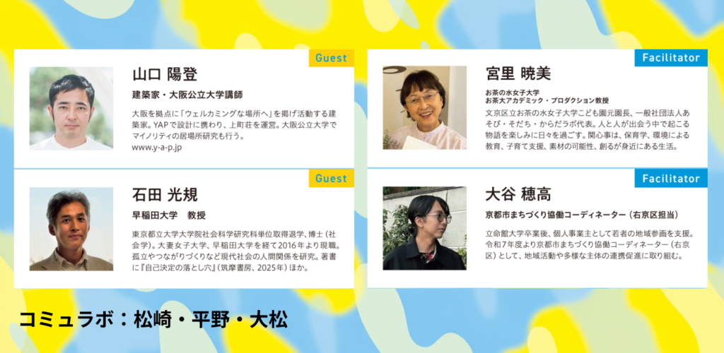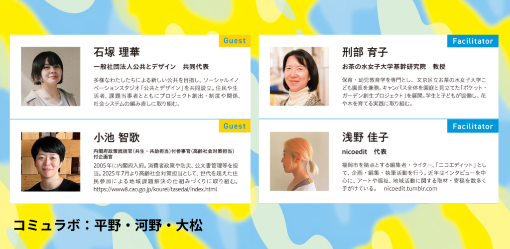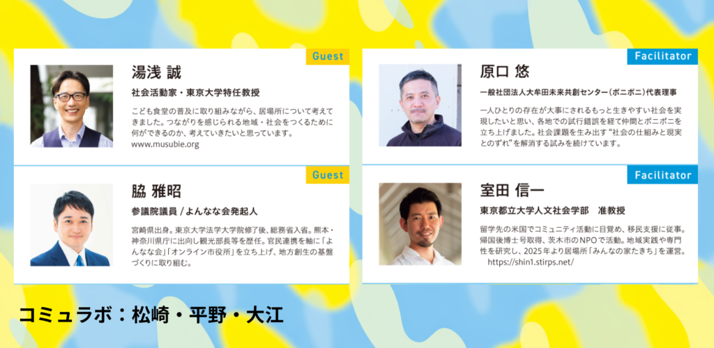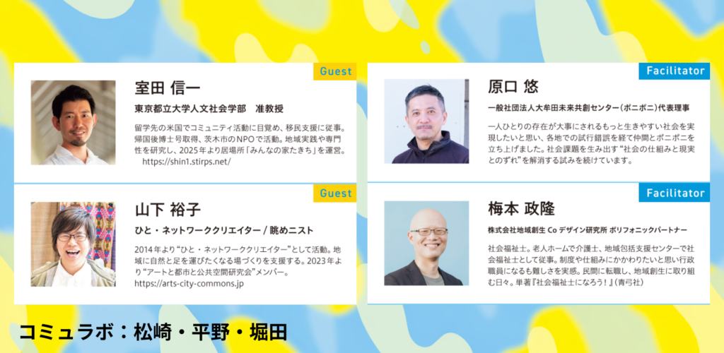 いよいよ、朝9時から続いたトークも最後。中には、6つすべてのセッションに参加してくださった方も多くいた。最終セッションでは、6年目を歩み始めたコミュラボが、これから地域の実践をどのように広げていくのかを切り口に、コミュラボのカルチャーや組織OS(組織を動かす価値観や仕組み)、さらには幸福やウェルビーイングといったテーマにまで議論が広がった。ゲストやファシリテーター、そして会場のみなさんも交えながら、それぞれの立場から率直な声が重なっていく。コミュラボのネクストステージは、どうなっていくのか。ぜひアーカイブでご覧ください。