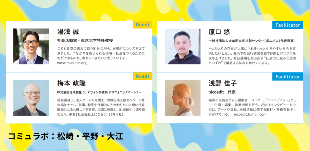 3つ目のトークテーマは「コミュラボの人のつなぎ方」。不登校というタグでは居場所には来づらい。でも、マリオカート大会には来たりする。本当に生活に困っている家庭は支援窓口には足を運びづらい。けれども、新鮮な食材や可愛らしいイラストには手が伸びる。コミュラボが実践してきたのは、支援を前面に出さず、「気になる」「面白そう」から始まる出会いのきっかけ。果たして、福祉とつながりは本当に相性がいいのか?そんな対話も繰り広げられた。